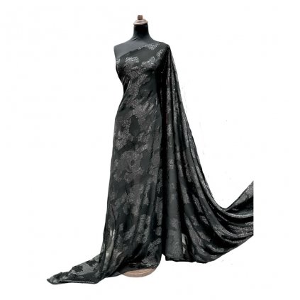 Nádherný viskózový splívavý šifon se zlatým žakárovým vzorem a krasným potiskem